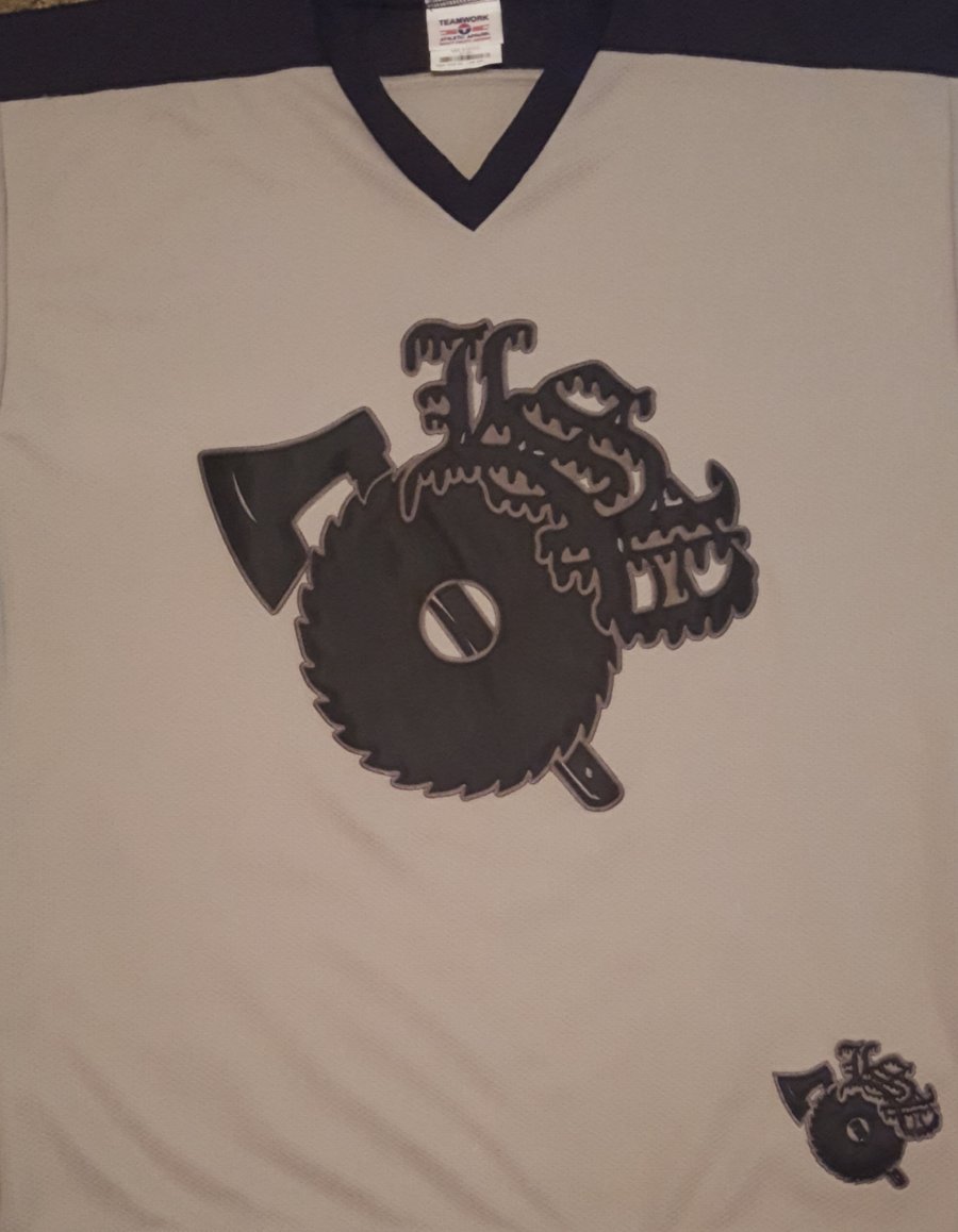 Grey with Black LSP embroidered on the front, with a small side patch embroidered, Nothing on the back, nothing on the sleeves. Made by TEAMWORK. 100% polyester
